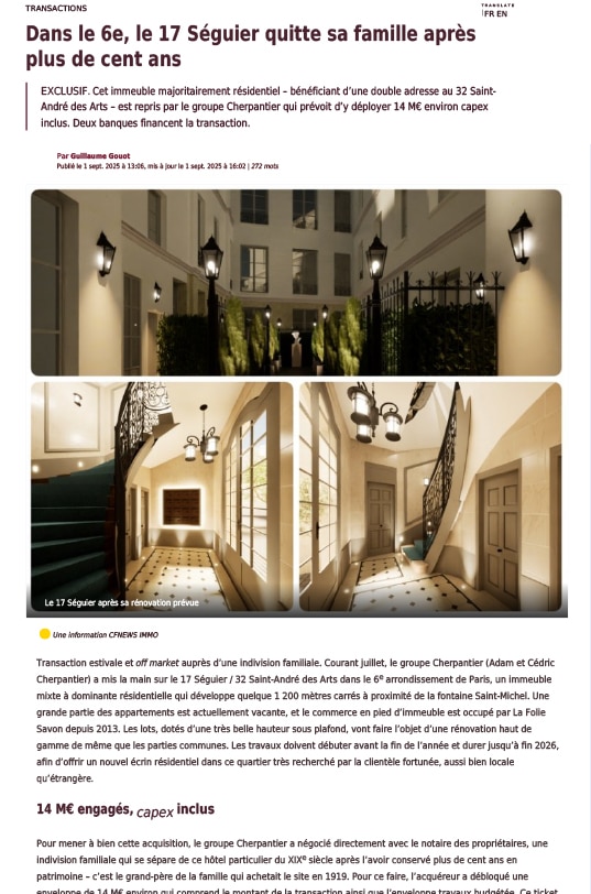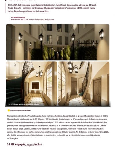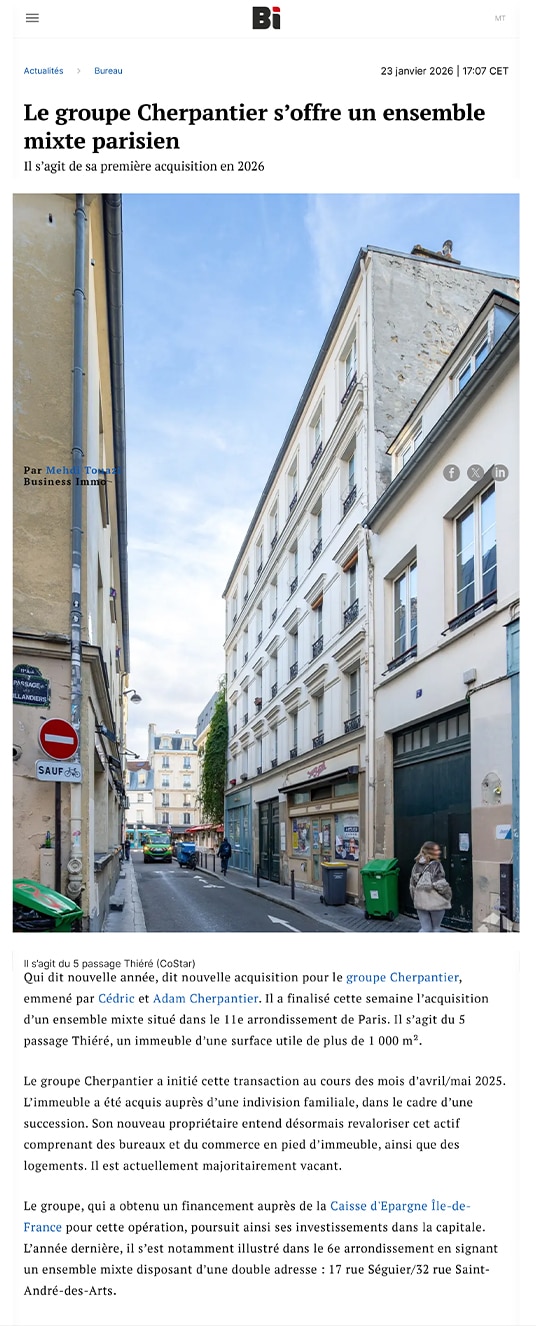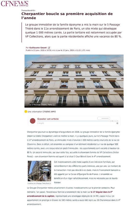 L’expérience accumulée durant ces années a permis aux membres du Groupe de devenir de véritables experts du marché parisien. Entourés de leurs notaires habituels, de leurs avocats et soutenus par leurs partenaires financiers, le Groupe Cherpantier a su développer au fil du temps une réactivité exceptionnelle pour toute opération et est à même d’évaluer la valeur patrimoniale d’un actif immobilier en quelques heures et se positionner en tant qu’acquéreur.
